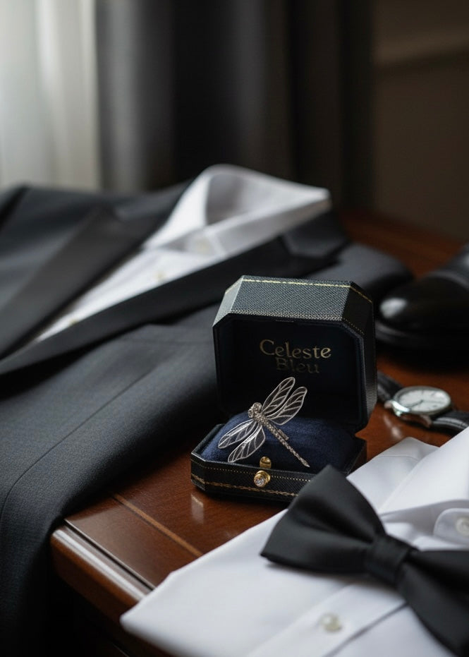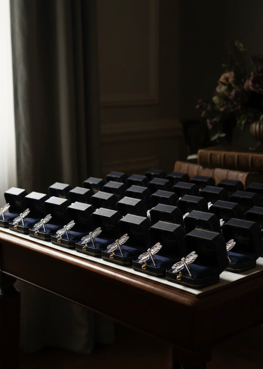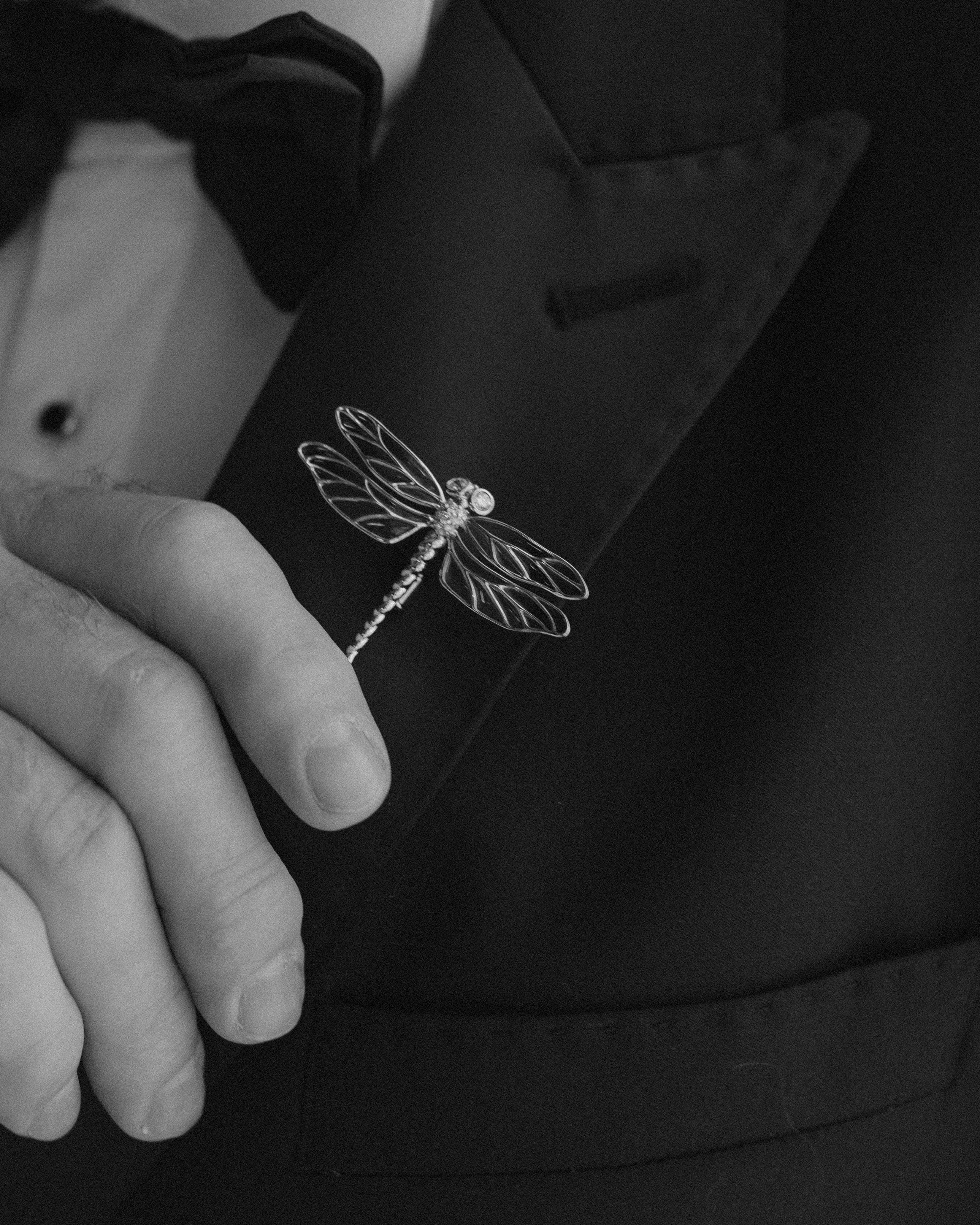 A couple who shared matching dragonfly tattoos invited us to reimagine their motif as a wedding keepsake. From this personal emblem, our atelier created a bespoke dragonfly brooch in silver, gold, enamel, and hand-set stones — a quiet, luminous memory carried home by every guest.