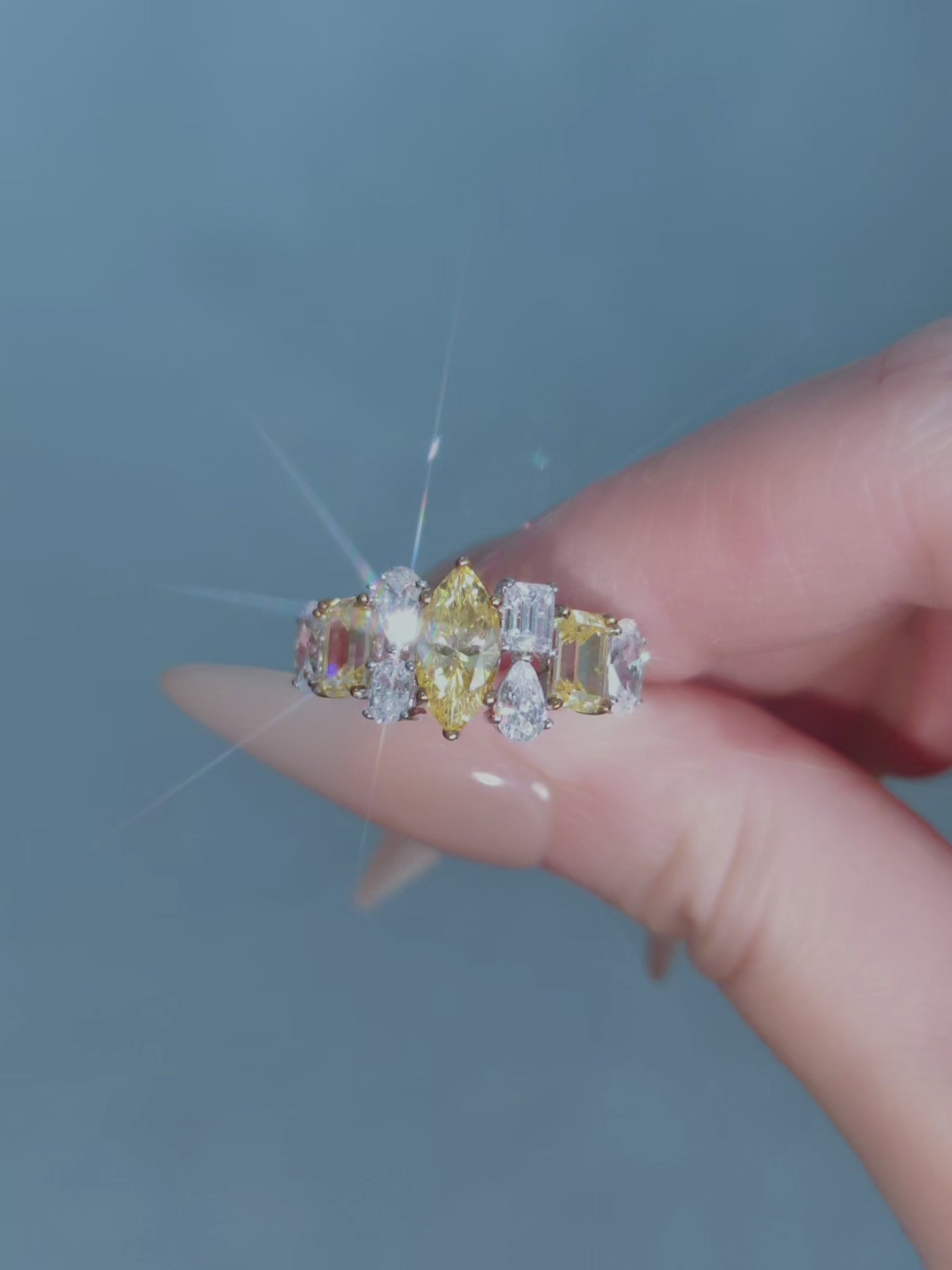 A marquise-cut yellow center glows amid an eclectic crown of mixed cuts — from emerald to pear — in radiant harmony. The stepped silhouette rises in symmetry and sparkle, evoking the regal curve of a diadem. A bold yet graceful design for brides seeking something distinctive and elevated.
