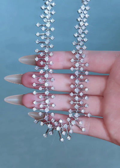 A dramatic composition of shimmer and symmetry, this set draws inspiration from grand chandeliers and evening opulence. The necklace radiates outward in rhythmic diamond silhouettes, capturing movement and precision in perfect balance. Long, sculptural earrings echo the same cascading brilliance, elongating the neck with elegance. Designed for the bride who commands light and attention.