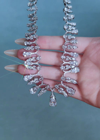 Bold yet graceful, this set evokes the elegance of a sculpted collar adorned with floral grandeur. The necklace features a dramatic fan of pear-cut drops framed by precision-cut accents, creating a sense of rhythmic bloom around the neckline. Coordinating earrings echo the silhouette with a refined, regal finish. A statement piece for the bride drawn to confident romance.