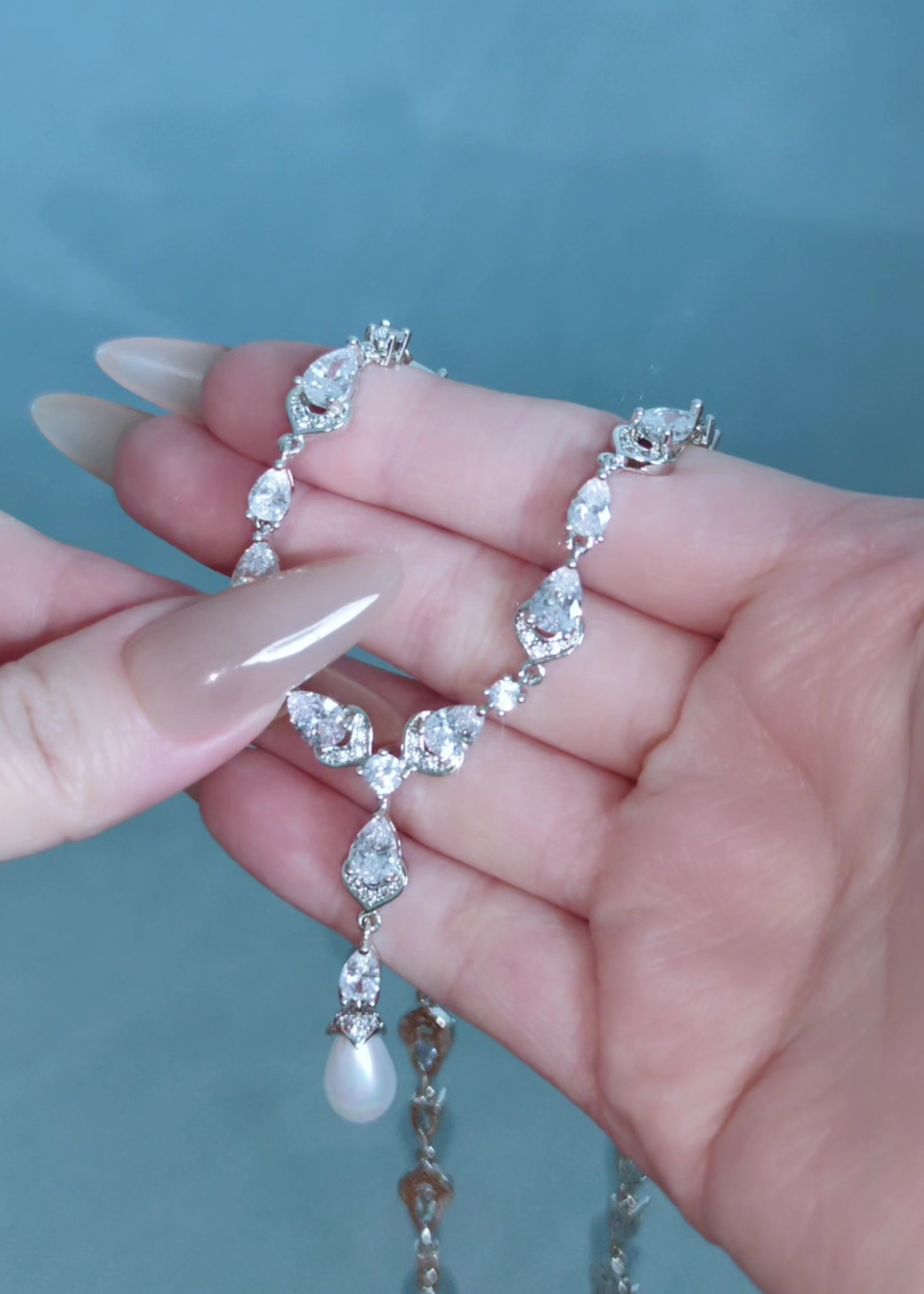 Softly radiant and delicately composed, this bridal set balances crystalline brilliance with a single lustrous pearl. The necklace’s gentle V-line leads to a dewdrop-inspired pendant, where the pearl hangs like a breath of stillness. Paired with matching earrings, this set is a tribute to romantic minimalism — graceful, luminous, and quietly captivating.