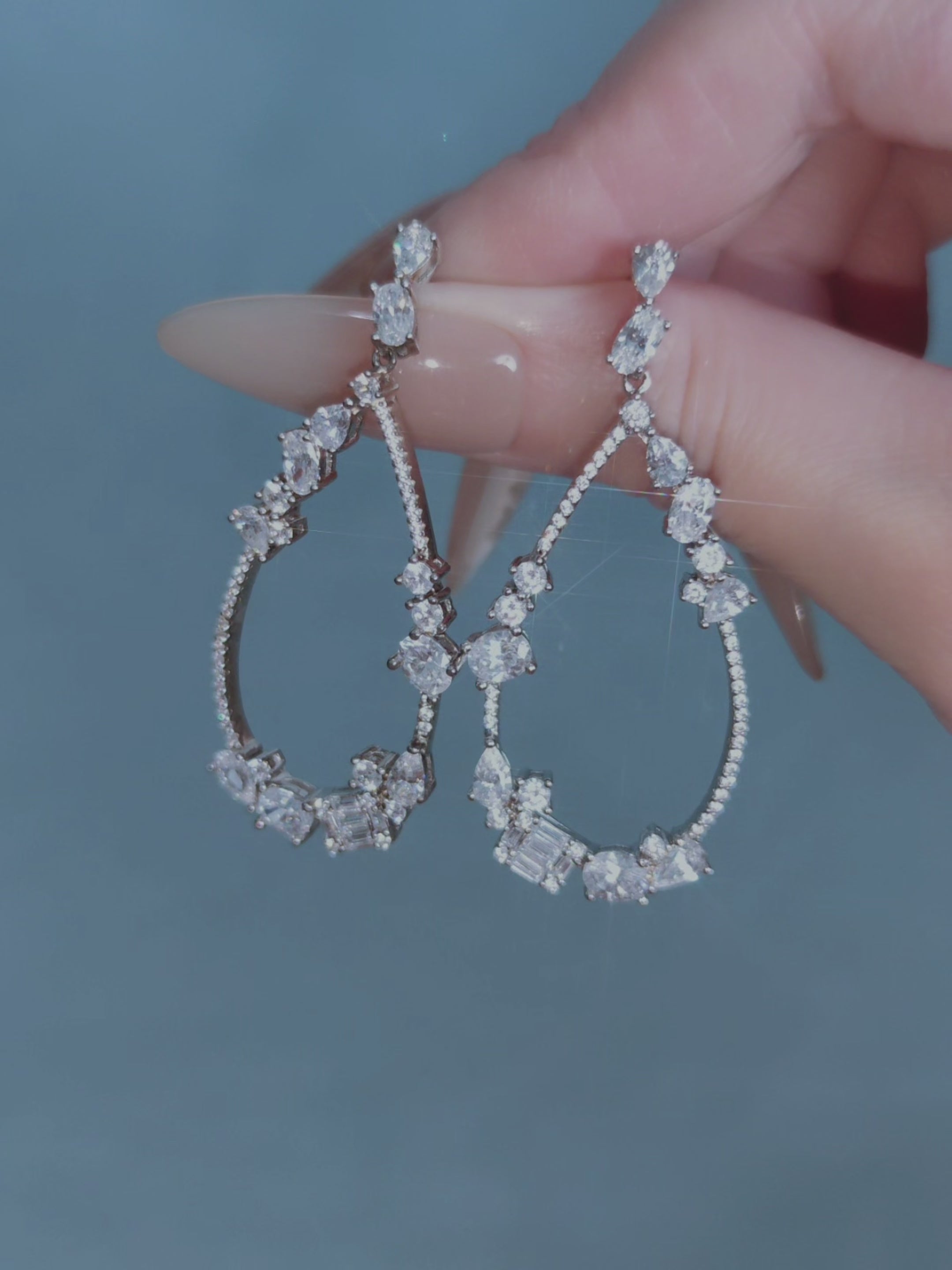 A graceful teardrop silhouette is traced with fine pavé and adorned with an airy constellation of brilliant and baguette-cut stones. Lightly sculptural with an elongated form, these earrings evoke celestial elegance with a modern edge. Perfect for the bride drawn to refined sparkle and elevated minimalism.