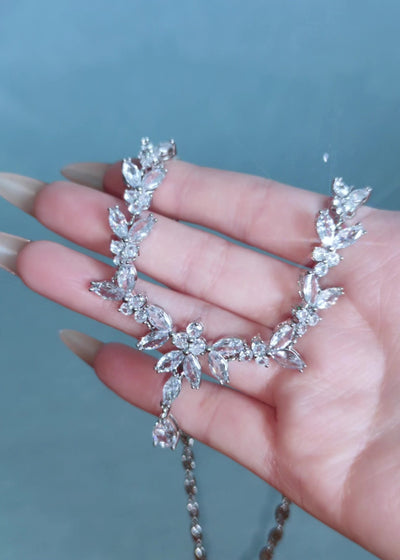 A composition of botanical elegance, this bridal set evokes the lightness of falling petals in motion. The necklace arcs in a graceful vine of marquise silhouettes, blooming into a central floral motif with a glimmering drop. Coordinated earrings echo the same flourish, framing the face with refined softness. An ethereal choice for the bride drawn to organic romance.