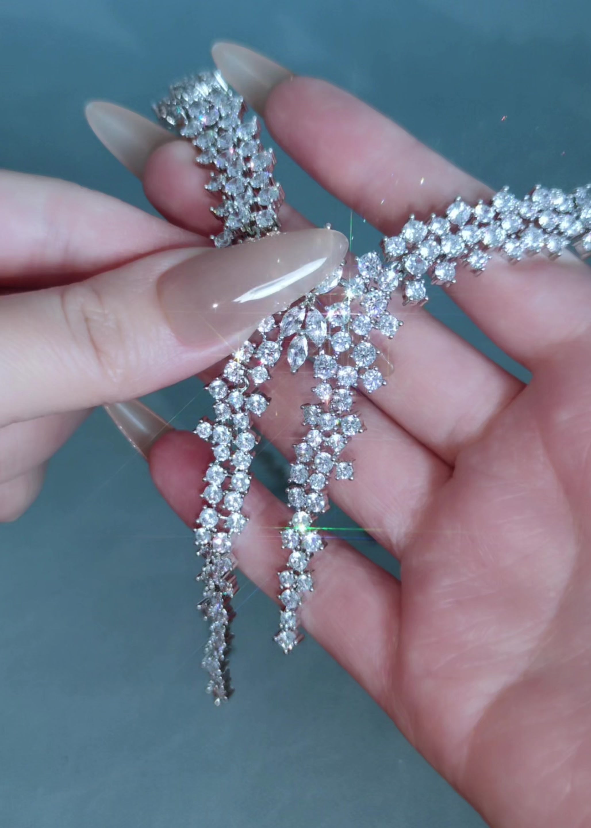 A crystalline cascade of light and form, this bridal set evokes the grandeur of falling snow under moonlight. The necklace curves elegantly around the neck before plunging into a split drop, where diamond-cut clusters shimmer in perfect symmetry. Paired with matching earrings that mirror the icy floral motif, this is a set for the bride who moves with grace — and leaves awe in her wake.
