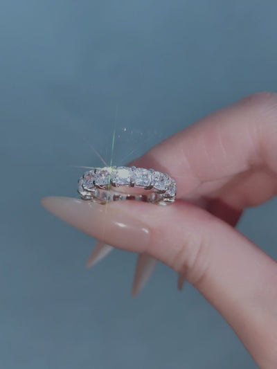 A continuous loop of oval-cut brilliance framed by sleek bar settings creates a bold, architectural silhouette. This eternity band balances clean geometry with radiant sparkle, offering a modern yet timeless feel. Striking on its own or stacked for added drama — a refined essential for the contemporary bride.