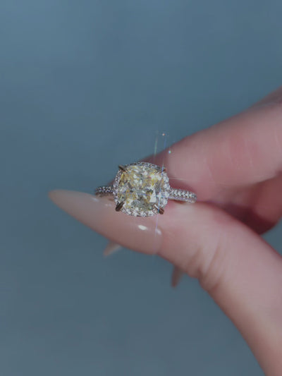 A bold cushion-cut yellow stone takes center stage, framed in a delicate halo of pavé brilliance. Its clean silhouette and double-row band create a balance of structure and sparkle. Sophisticated yet striking, this piece evokes quiet confidence and modern elegance. A luminous focal point for refined bridal styling.