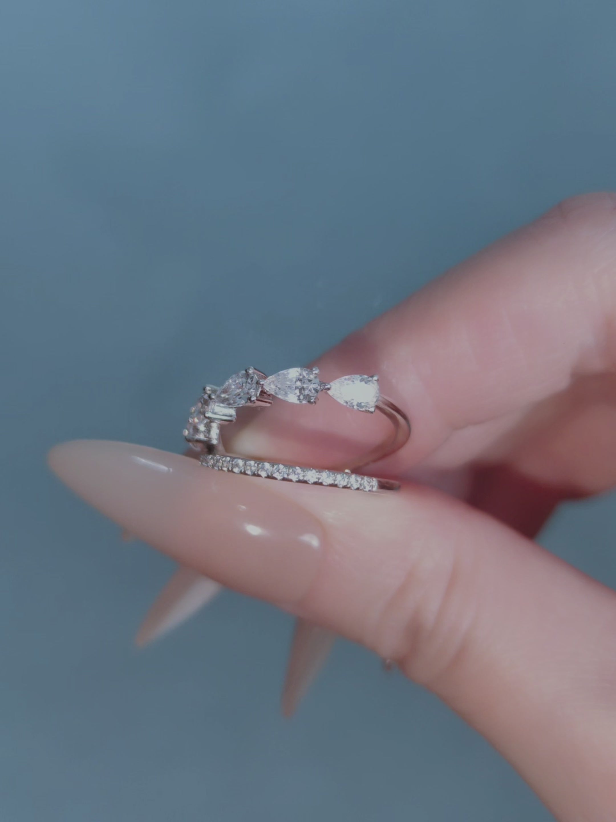 A romantic duet of pear and round-cut stones dances across a softly arched silhouette, echoing tender movement and grace. Below, a delicate pavé band adds refined sparkle and balance. Feminine and poetic, this ring evokes quiet intimacy — perfect for the bride drawn to elegant understatement.