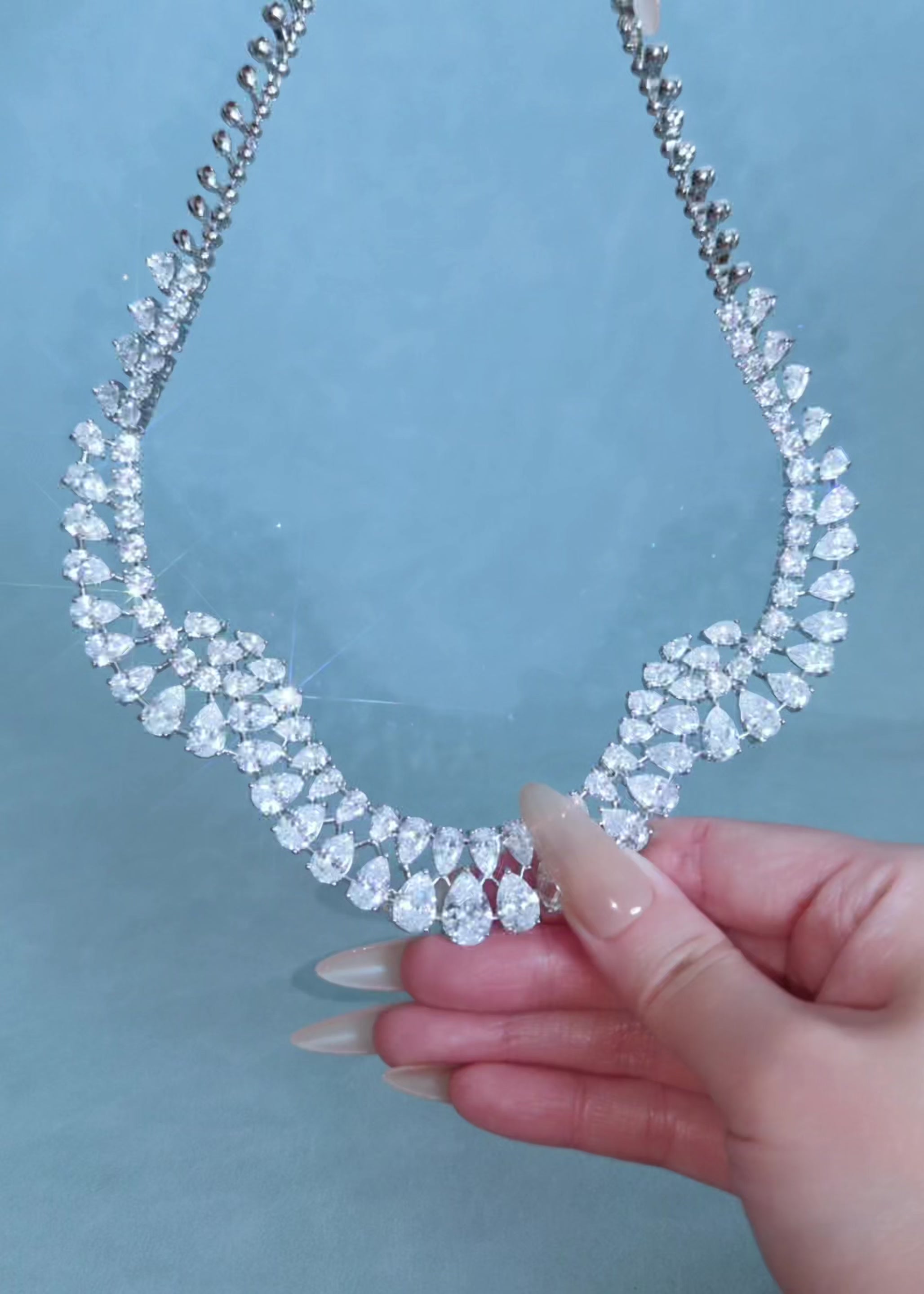 A bold yet fluid expression of symmetry, this set fans out in a regal collar of pear-shaped brilliance. The necklace curves with sculptural density, each stone placed to reflect light in layered arcs. Matching earrings form a dramatic open crescent, framing the face with sculpted luminosity. A striking choice for the bride drawn to power, precision, and shine.