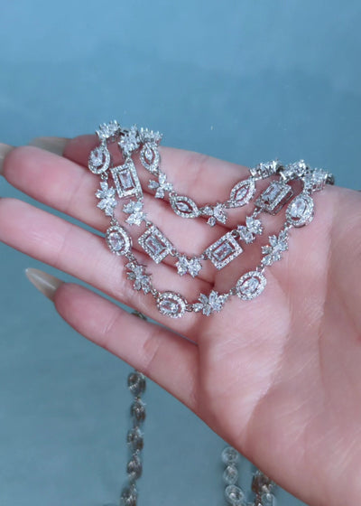 A vision of refined opulence, this bridal set draws inspiration from antique lace and heirloom regality. The three-tiered necklace drapes like a jeweled collar, each link detailed with intricate, romantic symmetry. Paired with sculpted drop earrings that frame the face in a halo of ornate sparkle, this set speaks to a bride who dresses with grace, legacy, and luminous intention.